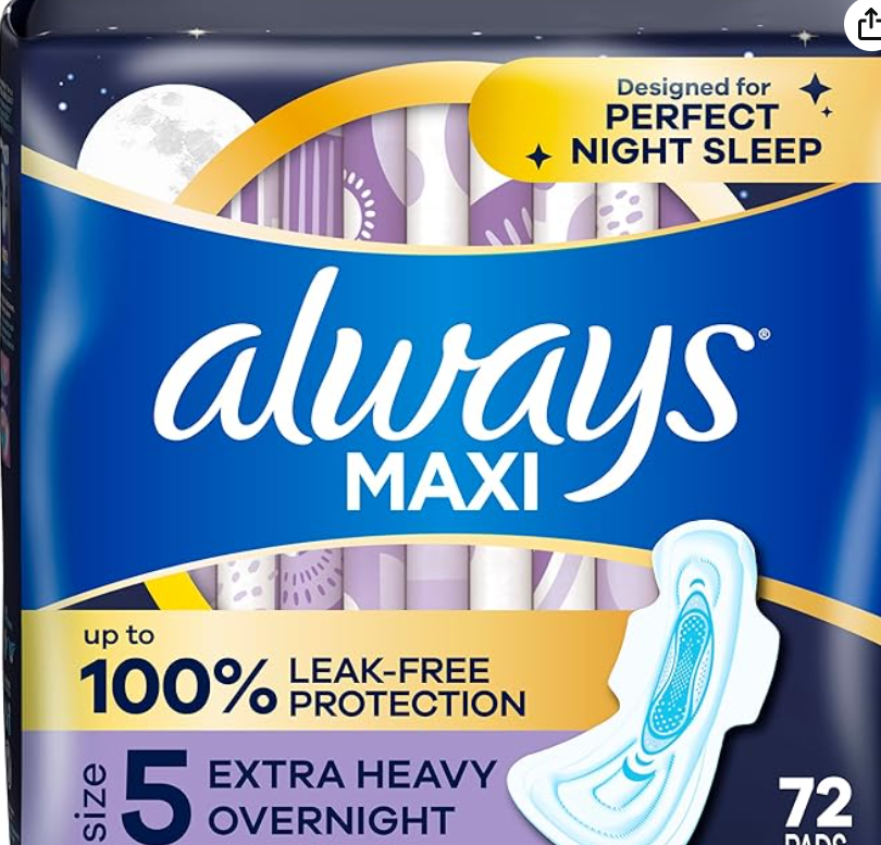 Always Maxi Overnight Feminine Pads with Wings for Women, Size 5, Extra Heavy Overnight Absorbency, Unscented, Up to 100% Leak-Free Protection, 27 Count