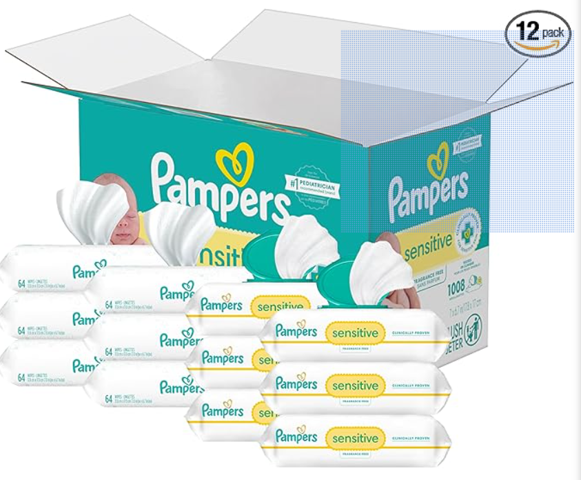 Pampers Sensitive Baby Wipes, WWater-Based Hypoallergenic and Unscented, 8 Flip-Top Packs, 4 Refill Packs (1008 Wipes Total)