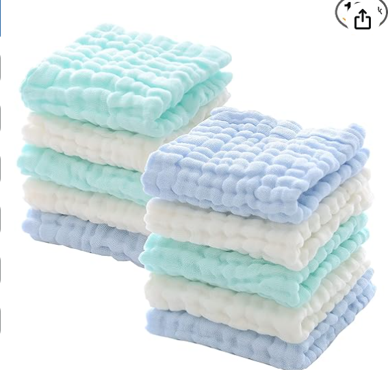 MUKIN Muslin Washcloths – Soft Face Cloths for Newborn, Absorbent Bath Face Towels, Wipes, Burp Cloths, Baby Registry as Shower. Pack of 10 (Green,Blue,White)